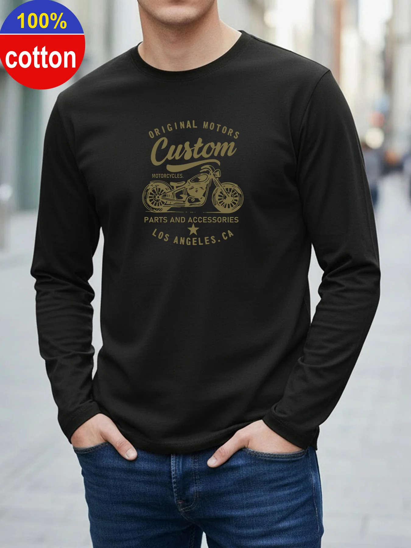 This 100% pure cotton long-sleeved T-shirt blends comfort and casual style for everyday wear. The loose fit and round neck provide easy layering and unrestricted movement, while the motorcycle T-pattern print adds a distinctive, versatile edge suitable for spring and autumn wardrobes. Soft, breathable cotton keeps you comfortable during transitional weather without feeling heavy.