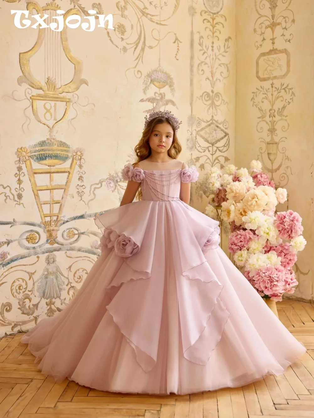 Soft and dreamy, the 2026 Girls Lilac Princess Dress brings timeless elegance to special occasions. Featuring an off-shoulder neckline and delicate 3D rose accents, the dress blends classic ball gown volume with modern floral detail. Layers of tulle create a full skirt that moves beautifully for pageants, flower girl duties, proms, or formal parties.