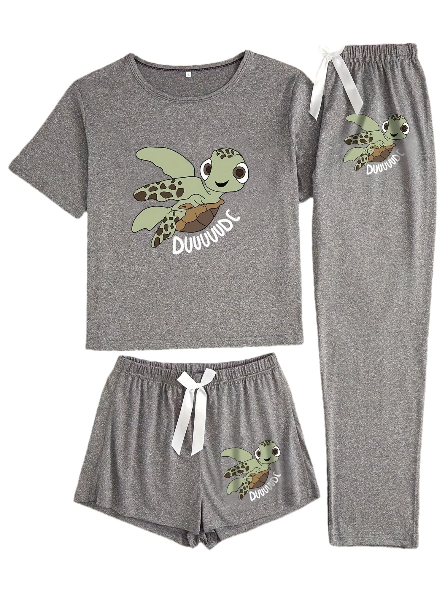 Cozy up in this whimsical 3-piece turtle pajama set designed for relaxed evenings and easy mornings. The set includes a short-sleeved top, matching shorts, and a coordinating cover or wrap—each piece adorned with a playful cartoon turtle print that adds a touch of charm to your loungewear collection. Lightweight and breathable, the ensemble is made for comfortable wear around the house and gentle layering when you want extra warmth.