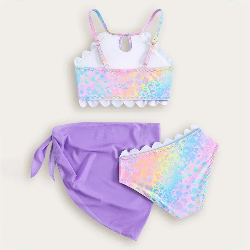 This 3-piece bikini set combines playful style with practical coverage for beach days and poolside fun. The sleeveless swim top pairs with a high-waist bikini brief and a matching skirt cover, creating a coordinated look that’s easy to wear and move in. Soft, quick-drying fabric helps keep kids comfortable during swims and splashes.