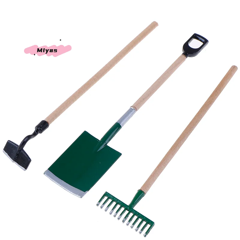 – Set of 3 metal miniature tools: shovel, hoe, rake