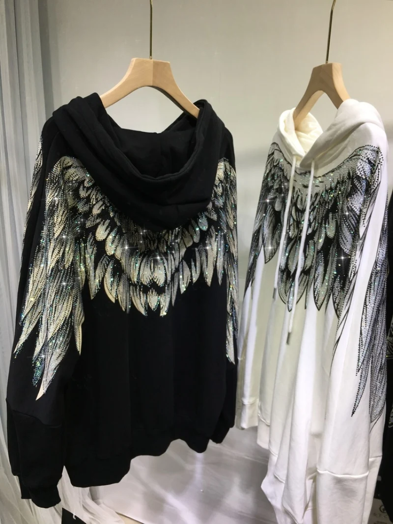This 4XL plus-size hooded sweatshirt blends streetwise styling with a luxe touch. Cut for a relaxed, unrestrictive fit, it features long sleeves and a roomy hood for layered comfort. Rhinestone-accented wing details add subtle sparkle and a distinctive visual edge, making it suitable for casual outings or coordinated couple looks.