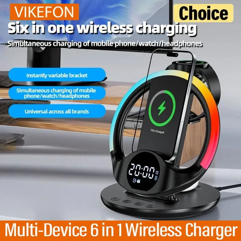 Keep your devices charged and organized with the 6 in 1 Multi-Device Wireless Charger. This compact charging dock combines a phone stand with a clear-view digital clock and RGB ambient lighting to create a tidy, functional bedside or desktop station. Designed to support a range of Qi-compatible smartphones along with compatible earbuds and smartwatches, it simplifies nightly charging and daily use while reducing cable clutter.