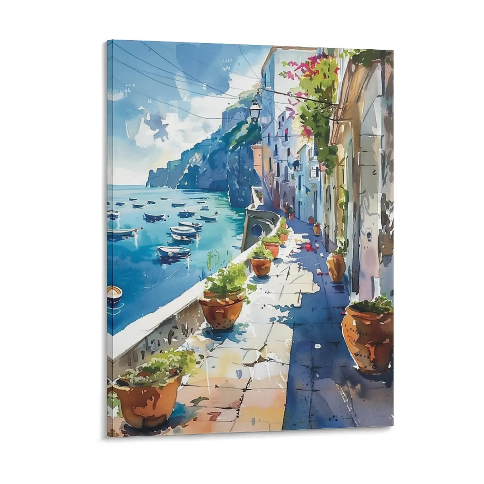 Bring the sun-soaked charm of the Amalfi Coast into your home with this digital watercolour canvas print. Soft, painterly strokes capture coastal architecture and sea-sprayed cliffs in a serene palette that complements kitchens, living rooms, or dining areas. The image is presented in a framed, cinema-club style layout that adds a touch of vintage design without overwhelming your existing décor.