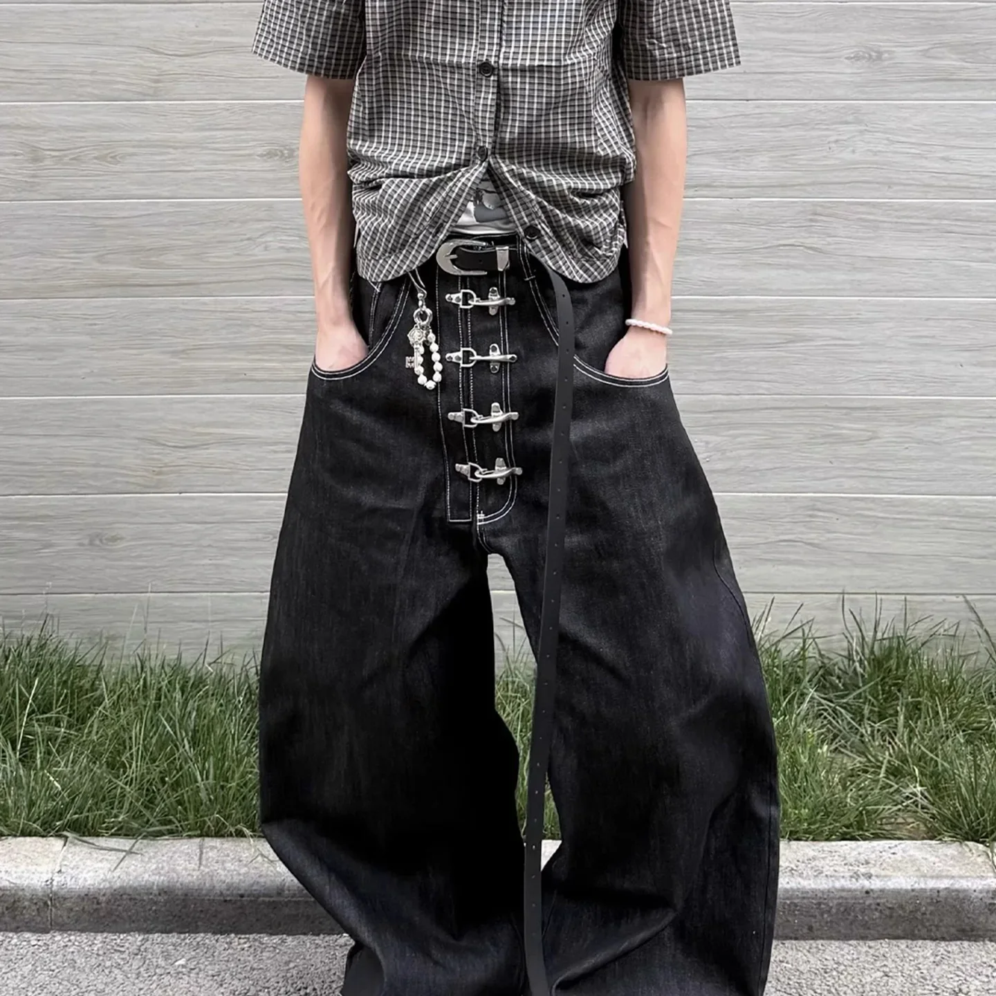 Take a look at American Retro Aircraft Buckle Design Denim Original Bull Knife Jeans Loose Long Trousers for Men And Women Baggy Silhouette available online.