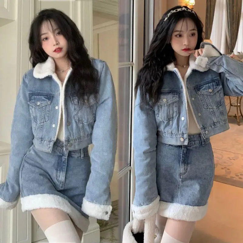 Autumn Winter Korean Edition Suit New Lamb Wool Spliced Denim Coat Women’s Short Sweet Cool Half Skirt Two Piece Set Trend