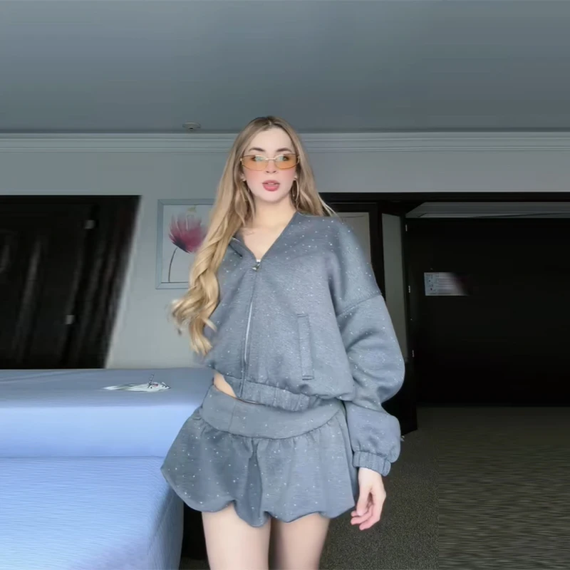 Step into the season with this Autumn Winter Rhinestone Hooded Jacket and Mini Skirt Set — a luxe-inspired sweatsuit designed for effortless party-ready style. The loose zipper hoodie offers relaxed layering with a sparkling rhinestone trim that adds subtle glamour, while the matching mini skirt balances comfort and flirty appeal. Together they create a coordinated look that’s easy to wear from casual outings to evening gatherings.