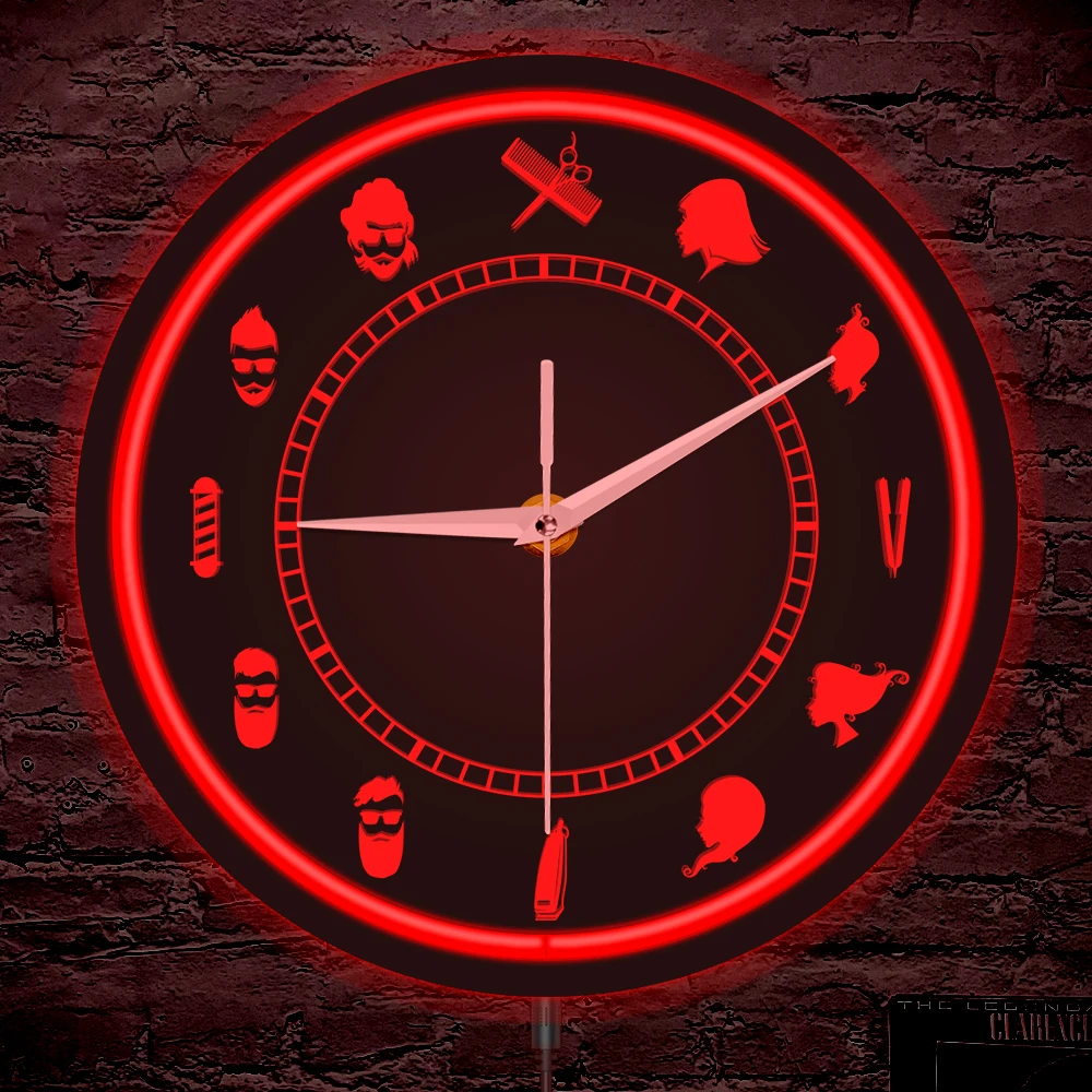 Explore Barber Shop Tools Glowing Wall Clock with LED Backlight Hair Beauty Salon Neon Light Sign Metal Frame Illuminated Wall Clock available online.