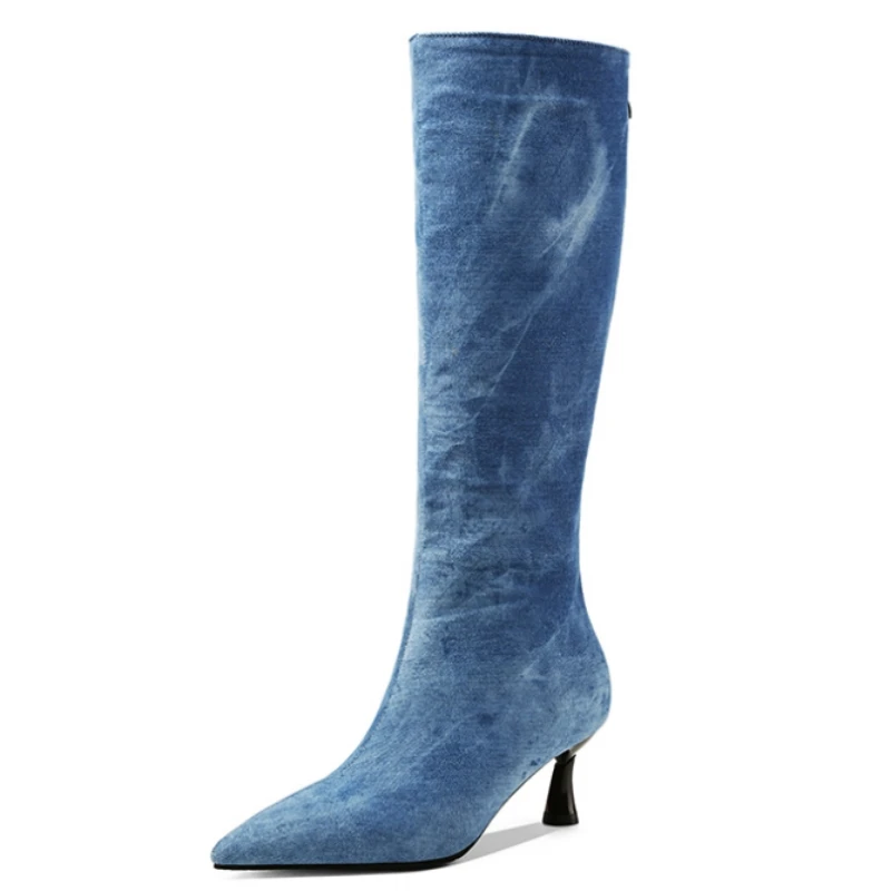 Step out in confident style with these Blue Jeans Knee High Boots — a versatile blend of denim texture and classic knee-high silhouette. Designed for spring and winter wear, the boots feature a pointed toe and a modest heel that elongates the leg while remaining suitable for day-to-night looks. The denim finish pairs naturally with jeans, skirts, and dresses for casual outings, parties, or dance nights.