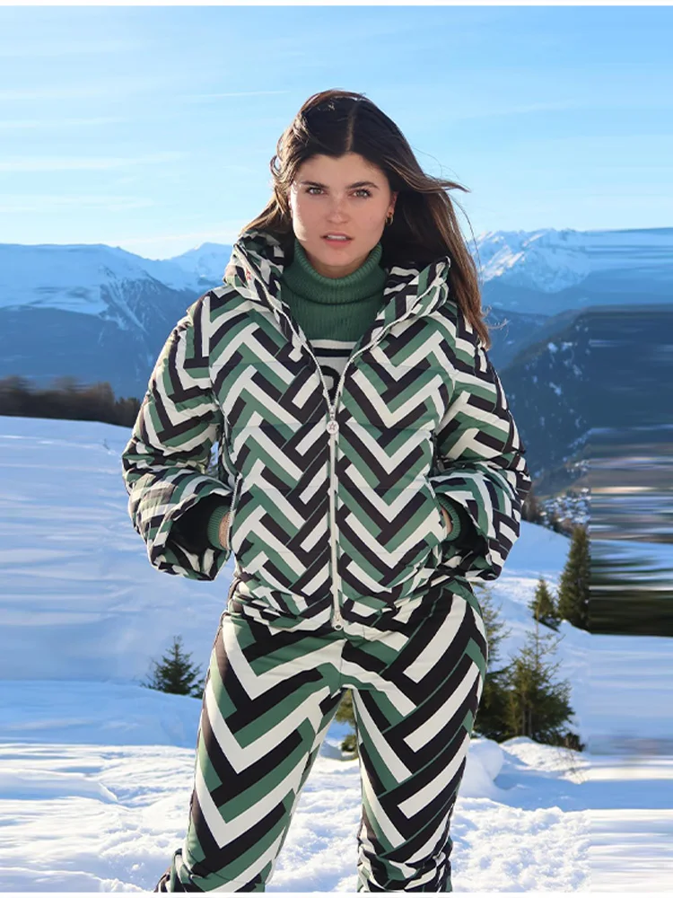 This Bold Black and White Striped Green Ski Suit delivers modern outdoor style with practical warmth for winter activities. The long-sleeved, hooded jacket features a full-length zipper for easy layering, while the matching pants provide coordinated coverage for cold-weather adventures. The bold stripe and green colorway create a sporty, contemporary look suitable for skiing, snow play, or everyday winter wear.
