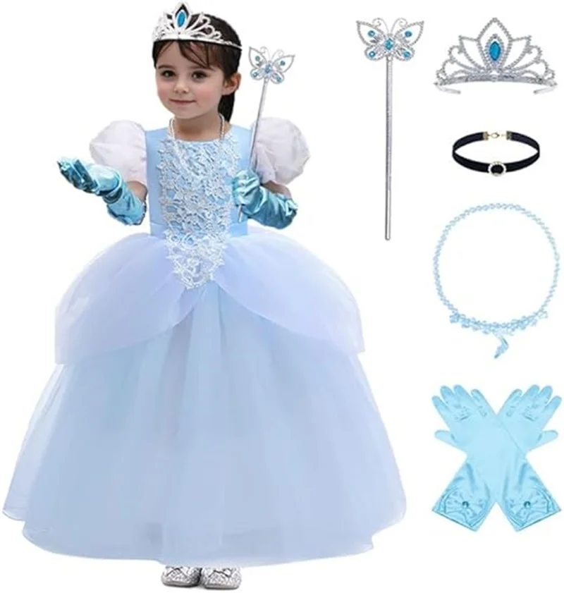 Delight your little one with this Cinderella Cosplay Costume—an enchanting choice for Halloween, school plays, or dress-up fun. The set features a sparkling sequined princess dress with a full ball gown silhouette that twirls beautifully, matched with a coordinating crown and gloves to complete the royal look. Designed for girls aged 3–10 years, the costume balances eye-catching style and comfortable wear for parties and carnivals.