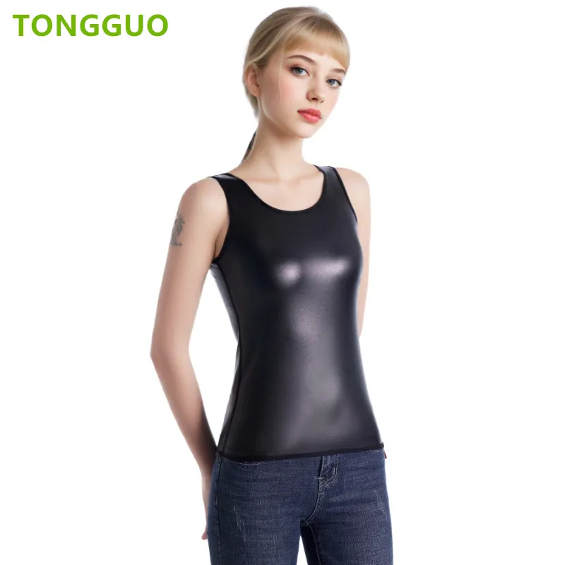 This sleeveless O-neck body shaper blends contemporary fashion with light compression to create a smooth, streamlined silhouette. Crafted in a sleek leather-look finish, this vest-style tank top layers easily under jackets or wears alone as a statement piece. The waist trainer design gently contours the midsection for a slimming effect while remaining comfortable for everyday wear.
