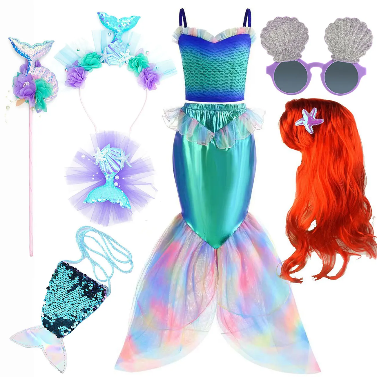Let her dive into imaginative play with this Disney-inspired mermaid dress up costume. Soft, comfortable fabric and a playful silhouette make it ideal for birthday parties, Halloween, cosplay events, or everyday dress-up. The design captures a classic mermaid look with bright colors and kid-friendly details that encourage creative storytelling and role-play.