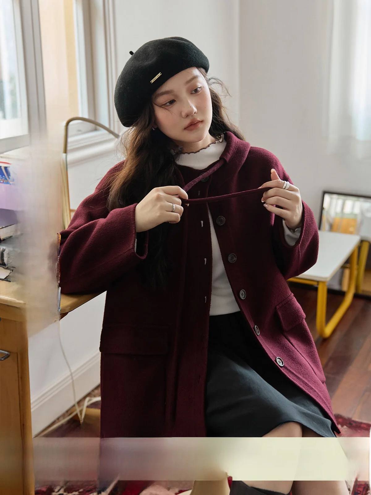 A refined double-faced woolen A-line hooded coat designed for everyday winter wear. The clean, minimalist silhouette skims the body for a subtly slimming effect while the A-line cut allows comfortable layering. The hood adds practical warmth and an effortless, casual touch suited for commuting or weekend outings.