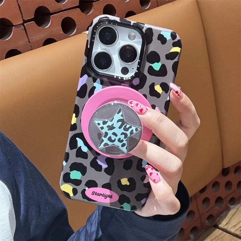 Protect your iPhone in style with this Fashion Color Leopard Print Magnetic Phone Case. Designed for compatibility with iPhone 14, 15, 16, and 17 Pro/Pro Max models, the case combines a bold leopard pattern with a slim profile and integrated MagSafe-compatible magnets for secure attachment to magnetic mounts and chargers. A built-in star-shaped stand unfolds to prop your phone for hands-free viewing, video calls, or easy browsing.