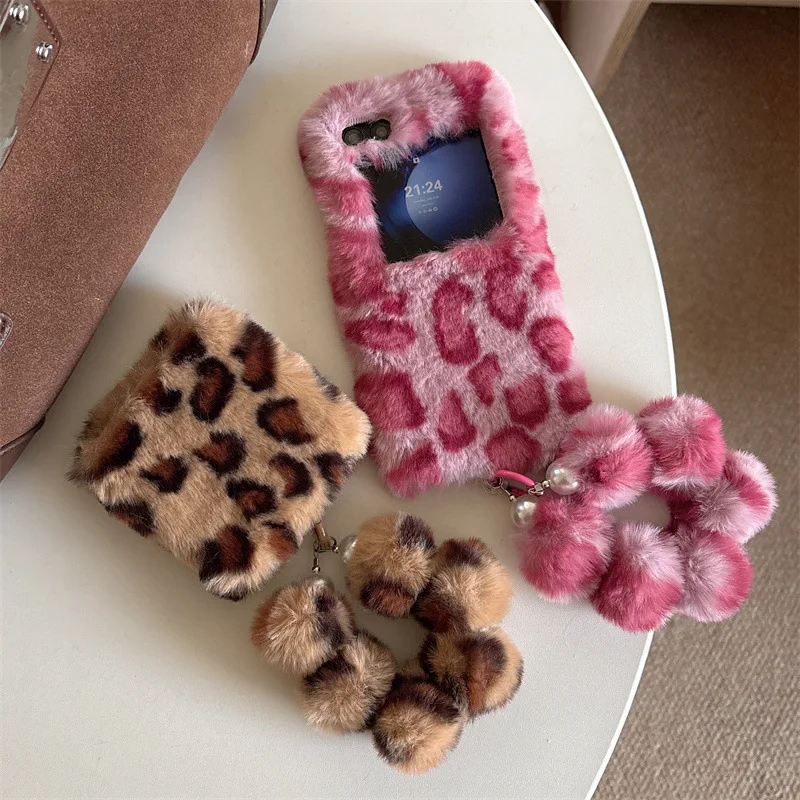 Fashion Leopard Print Fluffy Plush Wrist Strap Bracket Phone Case For Samsung Galaxy Z Flip 7 6 5 4 3 Zflip7 Shockproof Cover