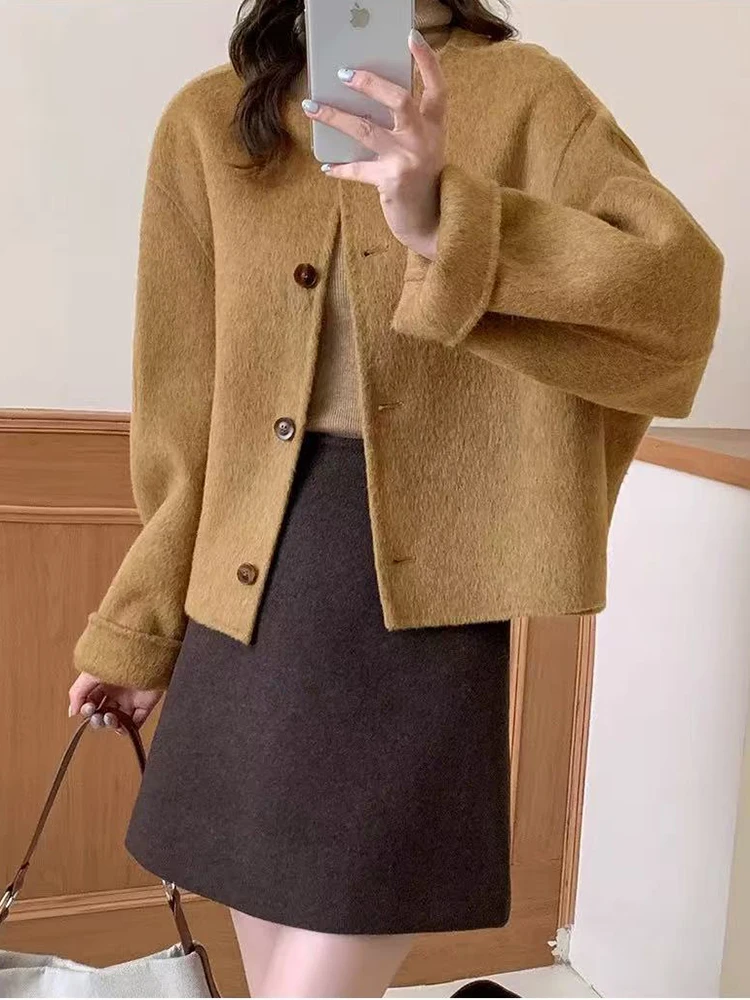 This faux wool coat blends Korean-inspired tailoring with a relaxed, feminine silhouette. Designed as a single-breasted crop jacket, it offers a polished yet easy-to-wear look that transitions smoothly from office meetings to weekend outings. The blended fabric delivers a soft handfeel and lightweight warmth suitable for spring and mild weather.