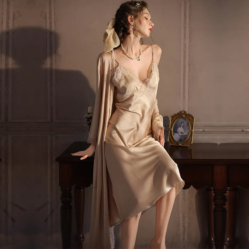 Female Long Nightgown 2PCS Robe&Gown Sets Sexy Lace Trim Night Dress Homewear Bathrobe Spring Summer New Sleepwear Loungewear