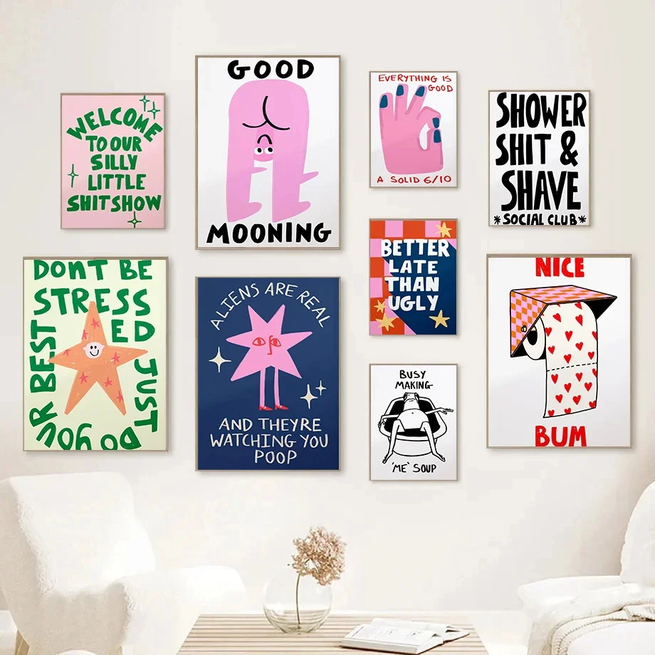 Add a touch of whimsy to your bathroom with this Funny Toilet Bathroom Poster set. Featuring playful alien and cartoon bum motifs paired with humorous slogans, these canvas prints bring lighthearted personality to family bathrooms, powder rooms, or dorm spaces. Their compact, frame-ready design makes them easy to hang or lean on a shelf for instant charm.