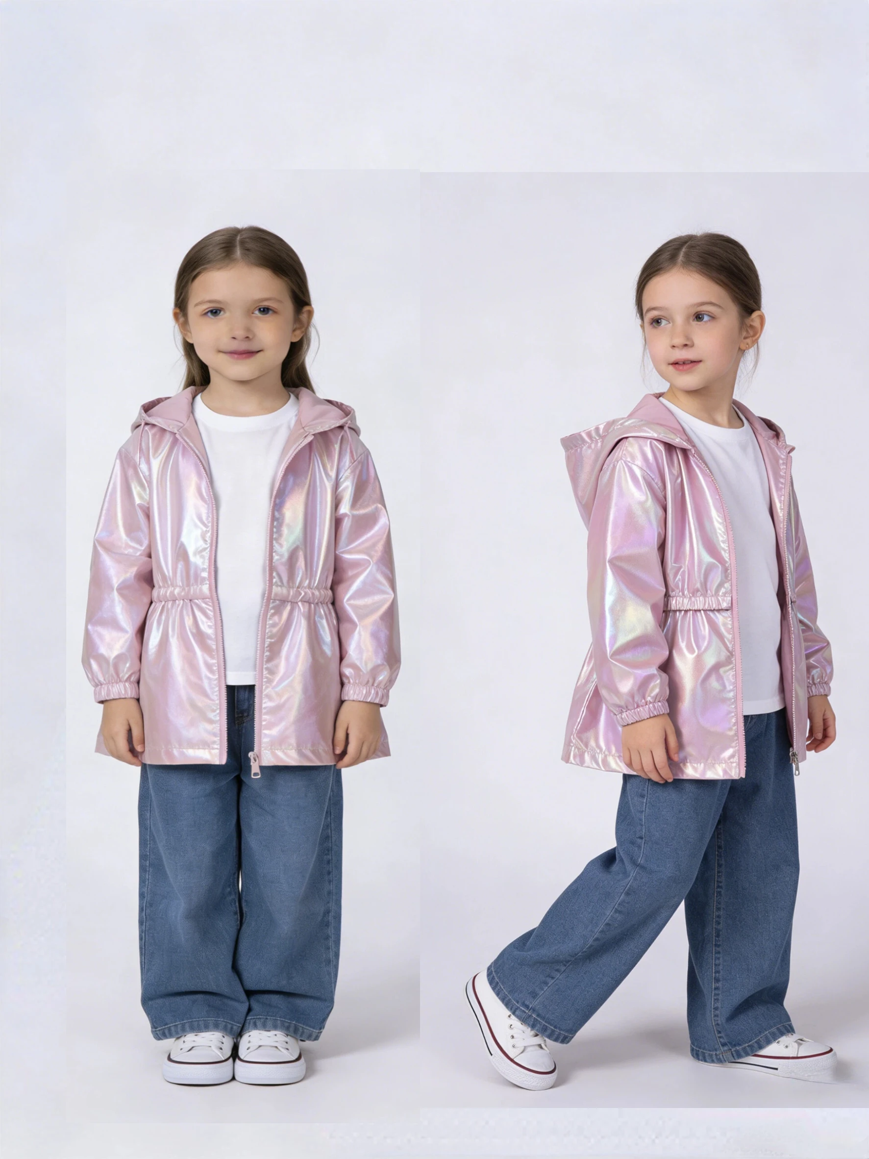 Girls’ Pink Iridescent Hooded Jacket is a shiny, windproof coat designed for everyday wear in spring and autumn. The loose-fit blouse silhouette allows for easy layering over tees and light sweaters, while the iridescent finish gives a playful, reflective look that catches light from every angle. A hood provides added protection from breezes and light drizzle, making it a practical choice for transitional weather.