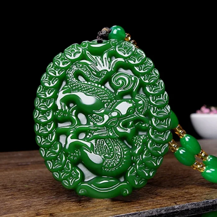Hand-carved from green jade, this Money Dragon pendant blends traditional Chinese symbolism with everyday wearability. The detailed dragon motif is crafted to sit comfortably on a sweater chain or everyday necklace, offering a subtle, cultural touch to both men’s and women’s outfits. Its smooth finish and compact size make it suitable for layering or wearing alone as a focal amulet.