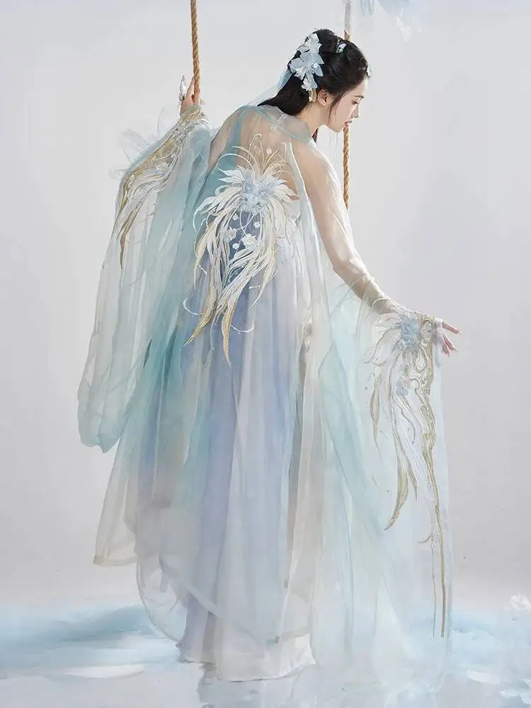 Hanfu Woman Big Sleeved Shirt Embroidery Fairy Suit Shoulder Strap Hezi Skirt Draped In Silk
