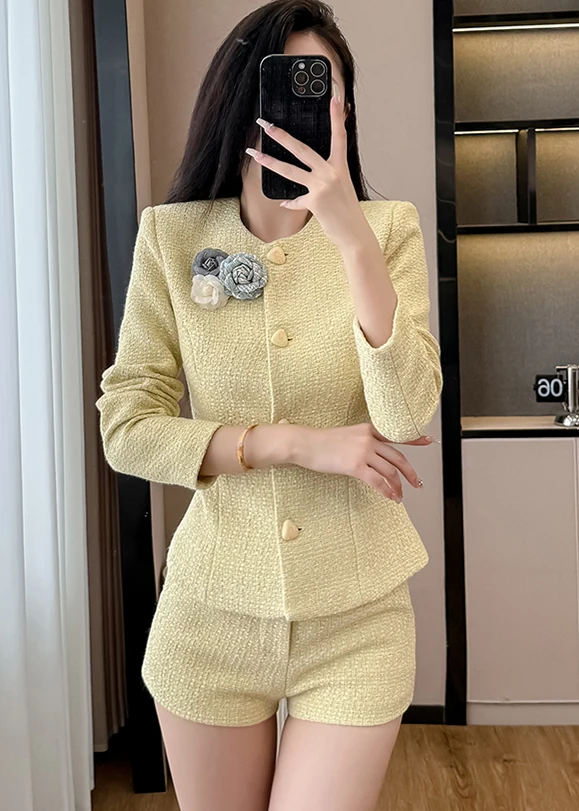High Quality Elegant Two Piece Set Yellow Tweed Long Sleeve Jacket Coat+Shorts Outfits 2025 Fall Winter For Women Office OL Suit