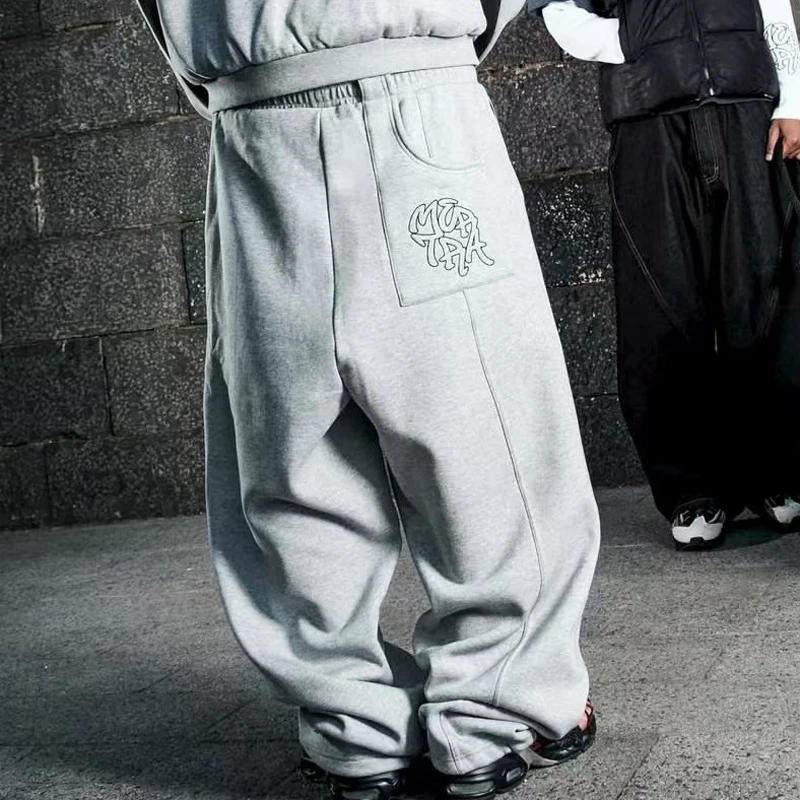High Street Men’s Clothing Mertra Casual Pants Embroidered Pattern Multi-pocket Autumn Winter Grey Fleece Sweatpants