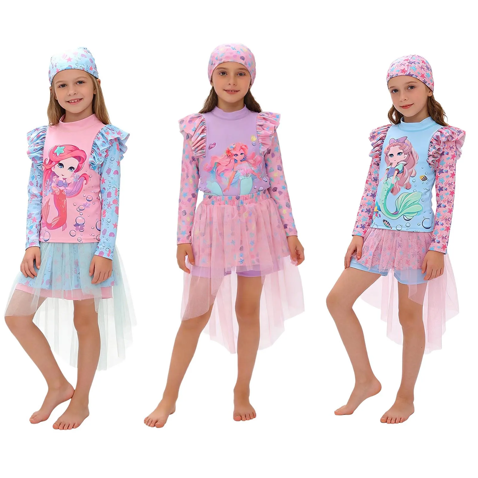 Make beach days magical with this Kid Girls 3-Piece Swimsuit set featuring a playful cartoon mermaid print. The long-sleeve swim top offers extra coverage for sun-smart play, while the lightweight fabric moves comfortably for splashing and swimming. A mesh overlay skirt adds a fun, floaty layer that emulates a mermaid’s tail without restricting movement.
