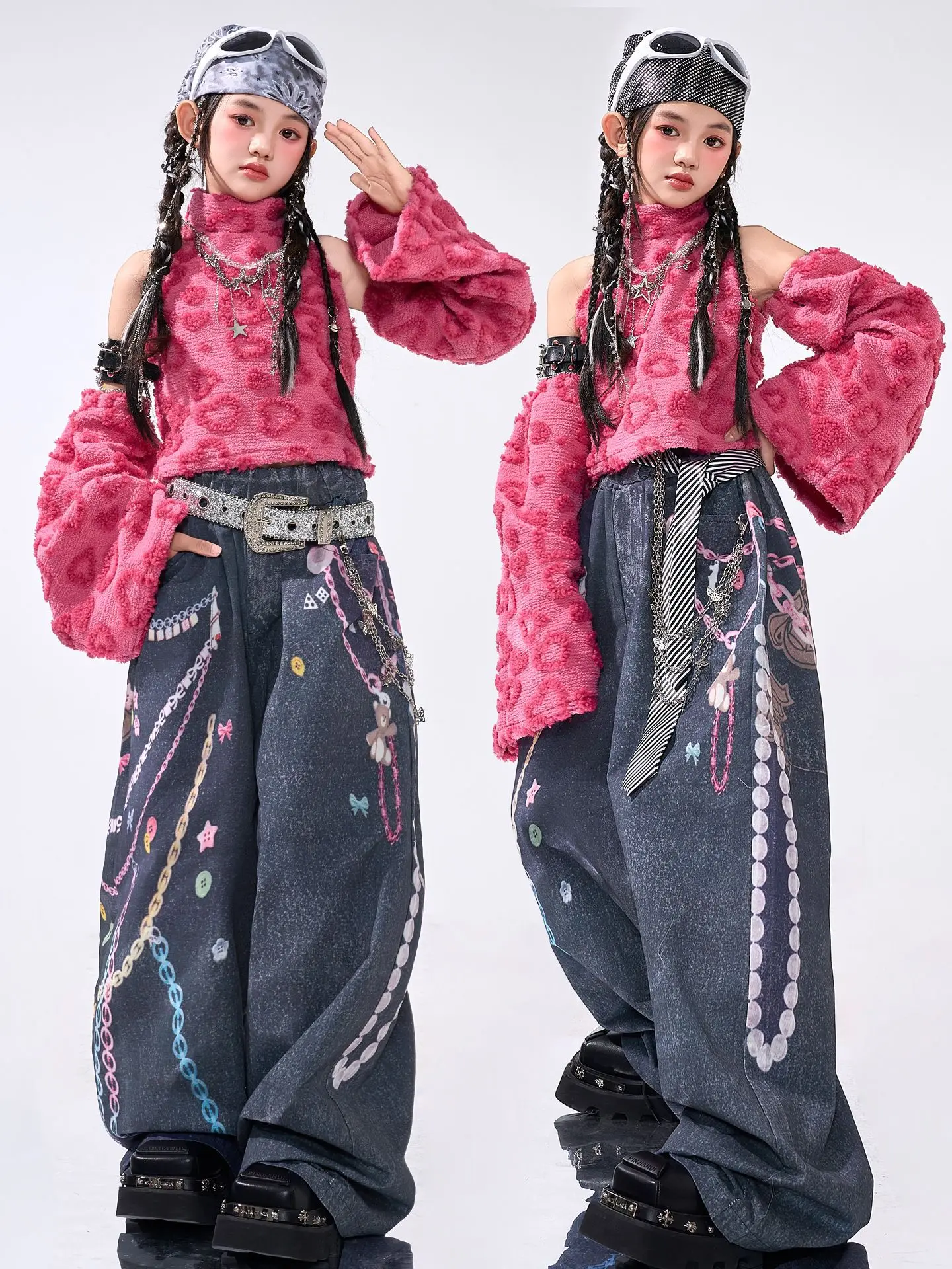 Bring bold street style to practice and play with this Kid Kpop Hip Hop outfit set. The pink fleece mock-neck crop tank pairs effortlessly with gray casual print baggy jeans, offering a trendy layered look that’s comfortable for dance rehearsals, performances, or everyday wear. Soft fleece on the tank provides cozy warmth while the mock neckline and cropped cut keep the silhouette fresh and modern.