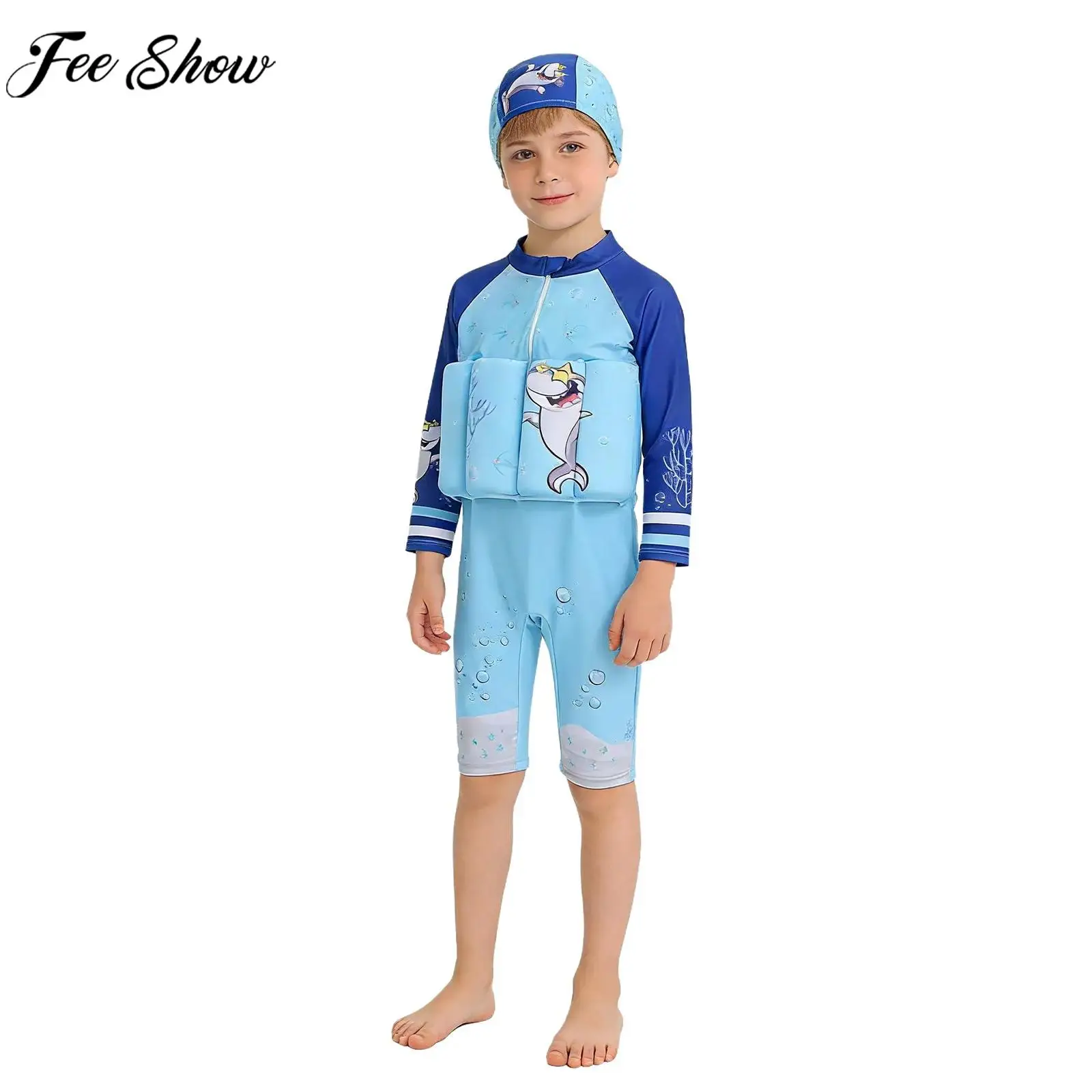 Kids Floatie Swimsuit Long Sleeve Floating Swimwear Bodysuit with Swim Cap Beach Pool Floatation Swimming Learning Bathing Suit