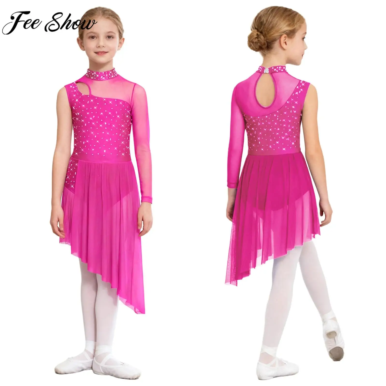 This sparkling modern lyrical dance costume combines stage-ready shine with comfortable design for kids and girls. Made with a glossy fabric front and delicate sheer mesh panels, the dress offers graceful movement and a flattering silhouette for lyrical dance, figure skating, gymnastics, and acrobatics practice or performance. Rhinestone accents add subtle sparkle under lights, enhancing every turn and extension without overwhelming the overall look.