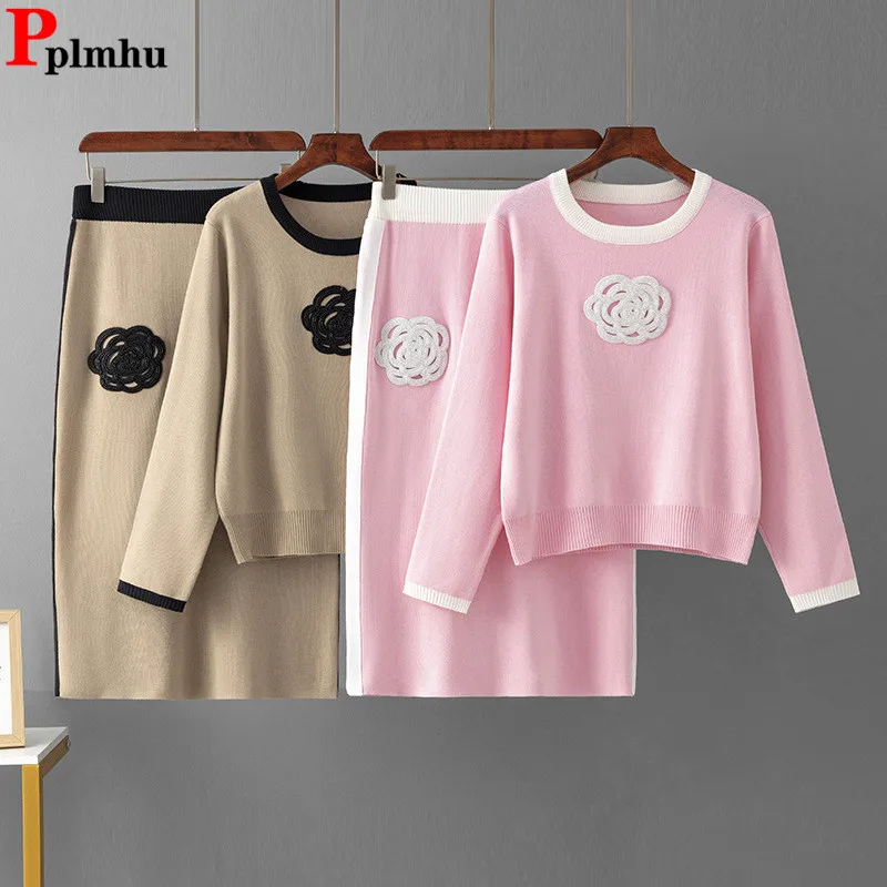 Korean Design Knitted 2 Piece Sets Women O-neck Knitwears Embroidery Sweater Pullover Conjuntos Casual High Waist Skirts Outfit