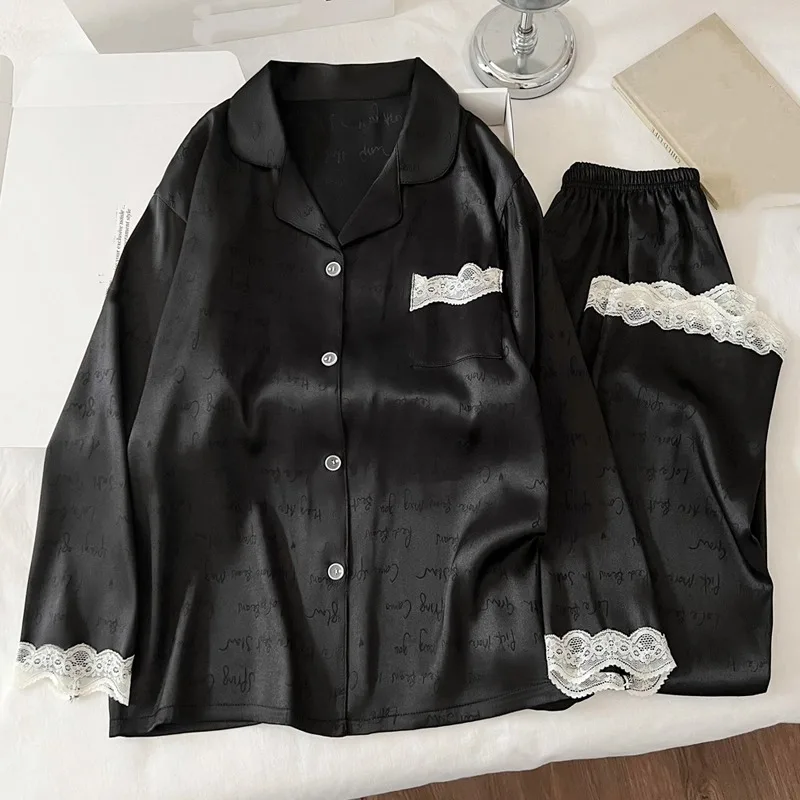 Discover effortless comfort with this Korean-style letter print lace women’s pajama set. Designed for relaxed evenings and cozy mornings, the lapel-neck top and matching long loungewear pants offer a soft, breathable feel ideal for autumn nights. The subtle letter print and delicate lace trim bring a simple, feminine touch to everyday sleepwear.