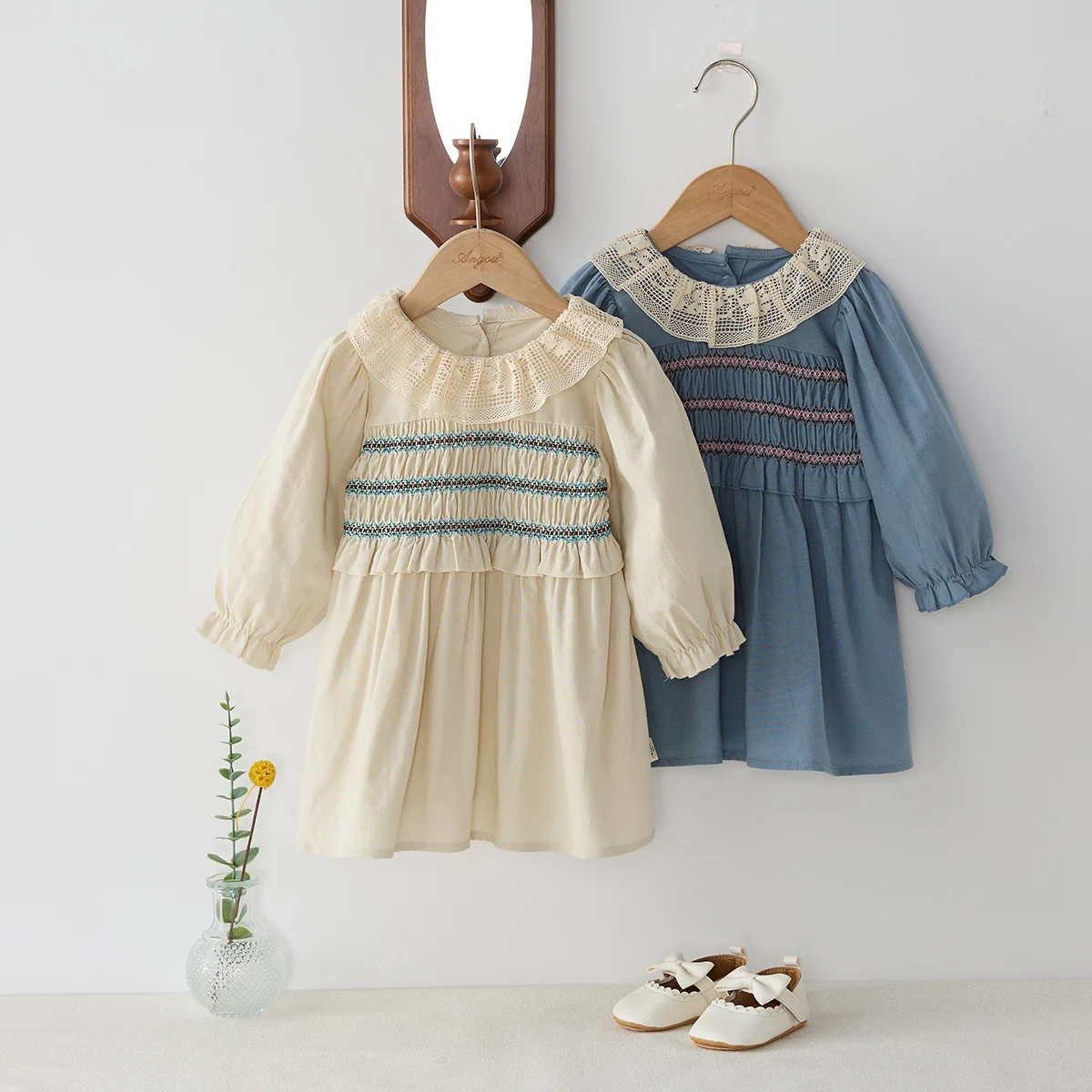 This Korean-style girl princess dress blends delicate lace with a doll collar and long sleeves for a timeless, sweet look. Designed for spring and autumn wear, the dress features a soft silhouette that layers easily and suits everyday outings or special occasions. The lace detailing and classic collar add feminine charm while keeping the overall design playful and age-appropriate.