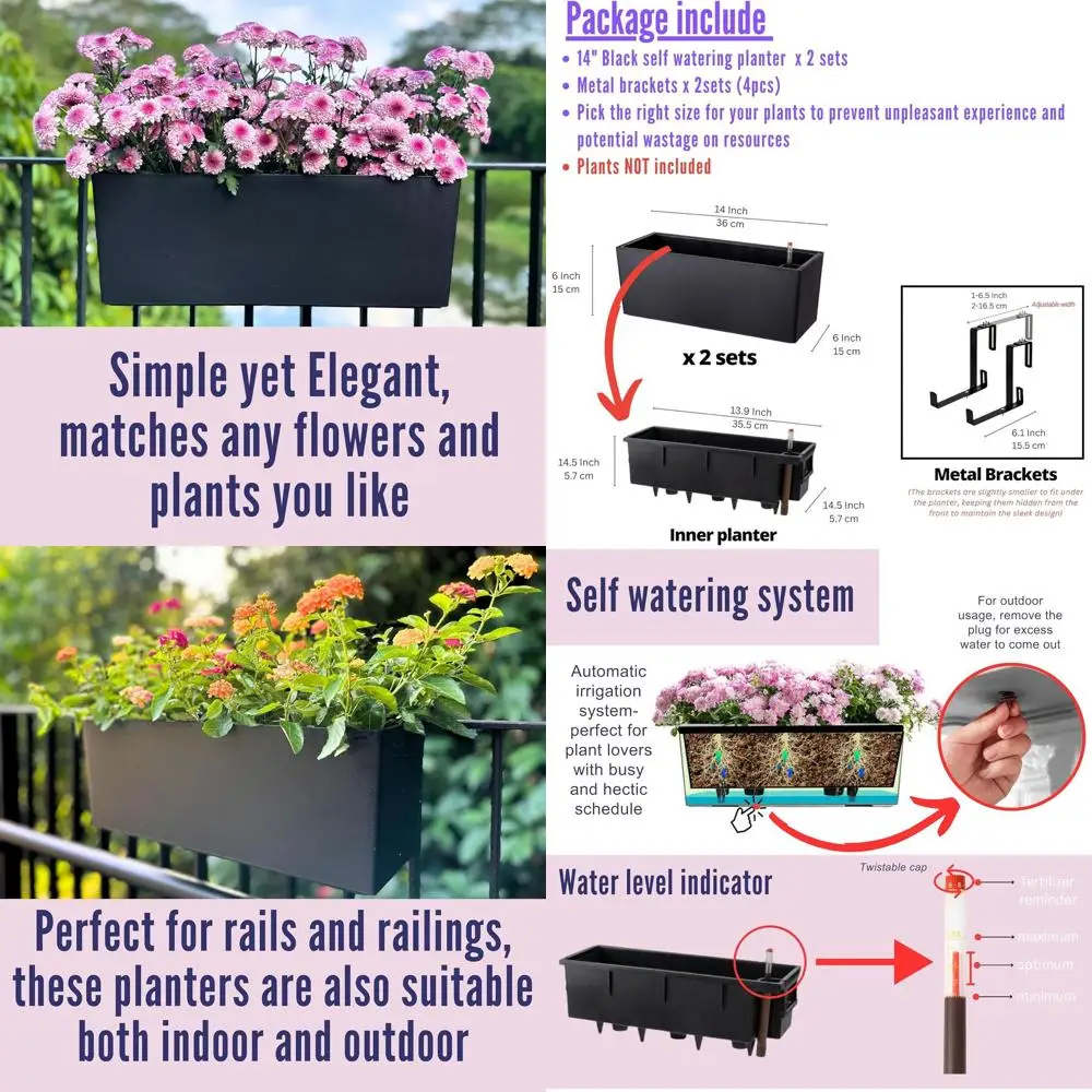 LaLaGreen Deck Railing Planters (14 Inch, 2 Pack) offer a clean, modern solution for adding greenery to balconies, decks, or windowsills. This set includes two black rectangular lower boxes with sturdy brackets designed for secure hanging on railings or mounting below windows. The included self-watering system helps maintain consistent moisture levels, reducing the need for frequent watering and supporting healthier plant growth.