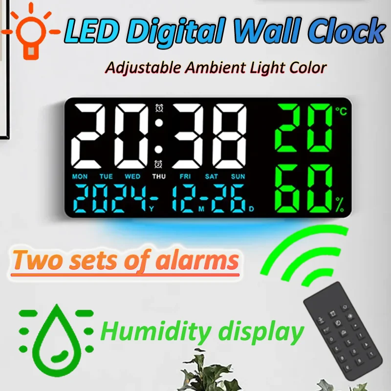 Brighten your space with the LED Digital Wall Clock featuring atmospheric lighting and a multifunction display. This modern clock shows time, temperature, humidity and date on a clear LED screen, with remote control for easy setting and adjustments from across the room. The dual alarm and timing functions make it suitable for bedrooms, offices, or living areas where both wall-mounted and tabletop placement are useful.