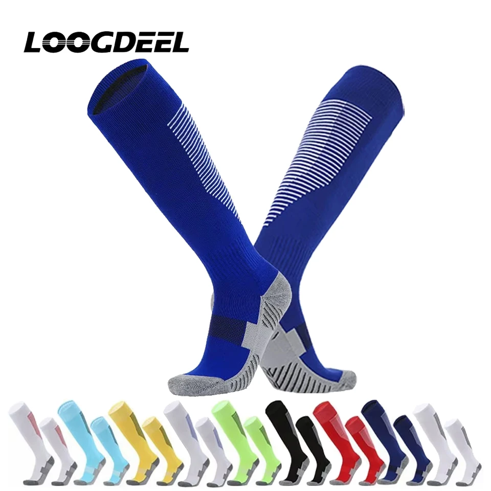 Loogdeel Towel Bottom Children’s Football Socks are designed for comfort and everyday play. These over-knee, long-tube socks feature a cushioned towel bottom to help absorb impact during running and jumping, while the non-slip construction helps keep the socks in place. The striped design adds sporty style suitable for football, soccer, basketball, or casual wear.