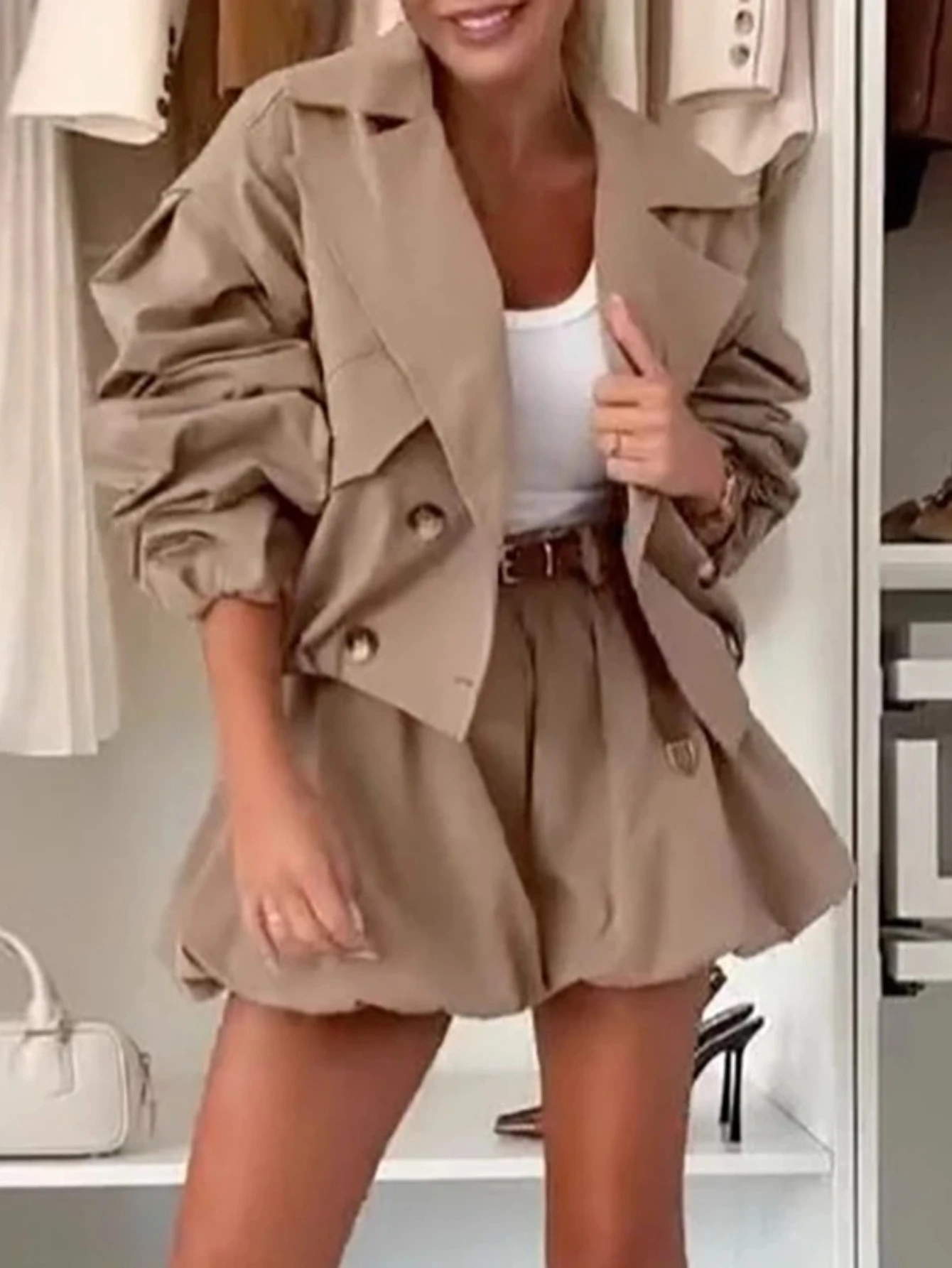 This loose two-piece women’s set pairs a relaxed long-sleeved jacket with matching shorts for an easy, fashion-forward autumn look. The jacket features a casual, slightly oversized silhouette with practical pockets and a simple closure, while the shorts offer a comfortable fit and cargo-inspired detailing for a utilitarian edge. Designed for everyday wear, the solid color makes it versatile for layering and mixing with wardrobe staples.