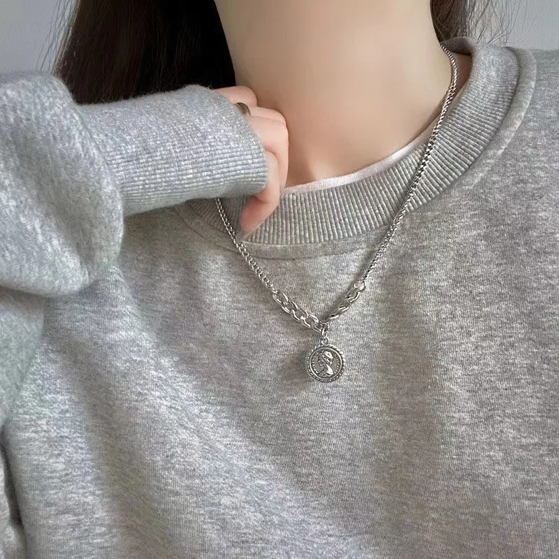 Lsy Sweatshirt Necklace for Women, Ins-Style Light Luxury Niche Cool Girl Portrait Coin Vintage Pendant, Simple Versatile Sweater Chain, White K