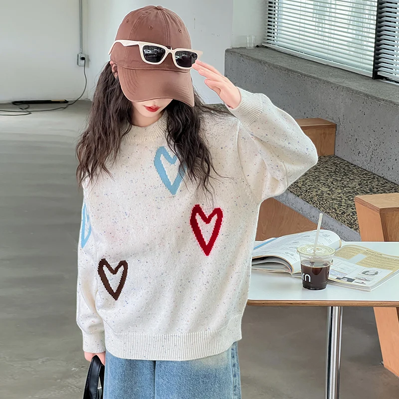 Soft, stylish and perfectly sized for little trendsetters, this Luxury New Kids Designer Sweater brings Korean-inspired charm to everyday wear. Crafted from a gentle knit, the pullover features a classic crew neckline and an all-over heart motif that adds playful detail without overwhelming the design. Lightweight yet cozy, it layers easily over tees or under jackets for versatile seasonal styling.