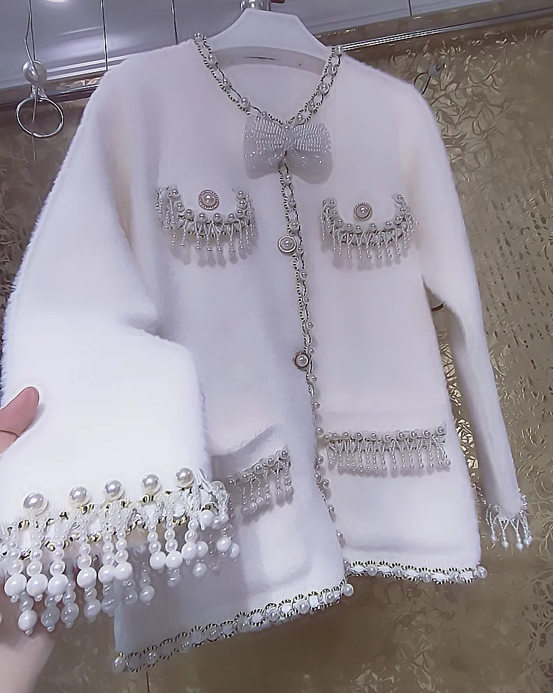 Discover Luxury Style Pearls Beads Tassels Faux Fur Knitted Thickened Cardigan Bowtie Beading Sequins Sweater Coat Outwear Jacket Tops.