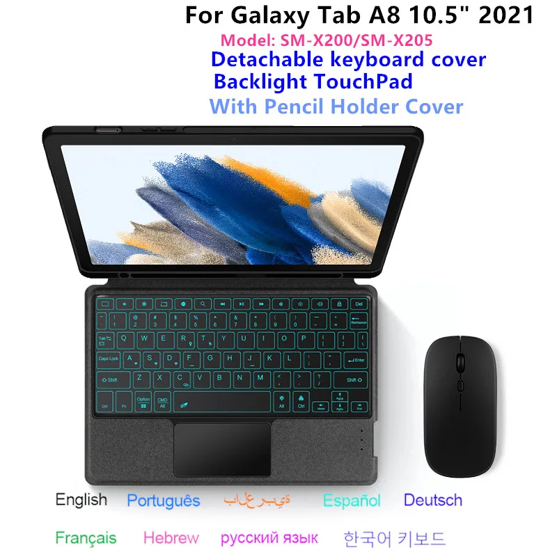 This Magic Keyboard is designed for the Samsung Galaxy Tab A8 10.5 inch (models SM-X200, SM-X205, X207), combining a protective case with a backlit keyboard and integrated touchpad. The slim folio design protects the tablet front and back while maintaining access to ports, buttons, and the camera. The detachable keyboard attaches magnetically for flexible use as a laptop-style setup or a lightweight cover for on-the-go convenience.