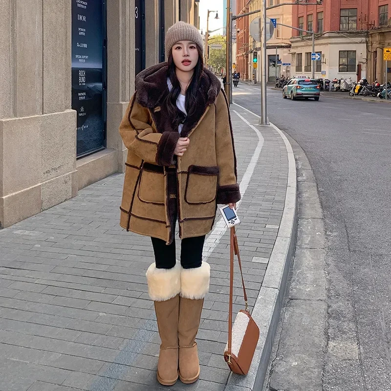 This Maillard Lamb Wool Coat blends cozy warmth with understated style for the colder months. Crafted as a one-piece design with a thickened wool-like finish and imitation suede accents, it delivers a soft, tactile feel and a structured silhouette ideal for everyday wear. The solid color keeps the look versatile, pairing easily with jeans, skirts, or layered over dresses.