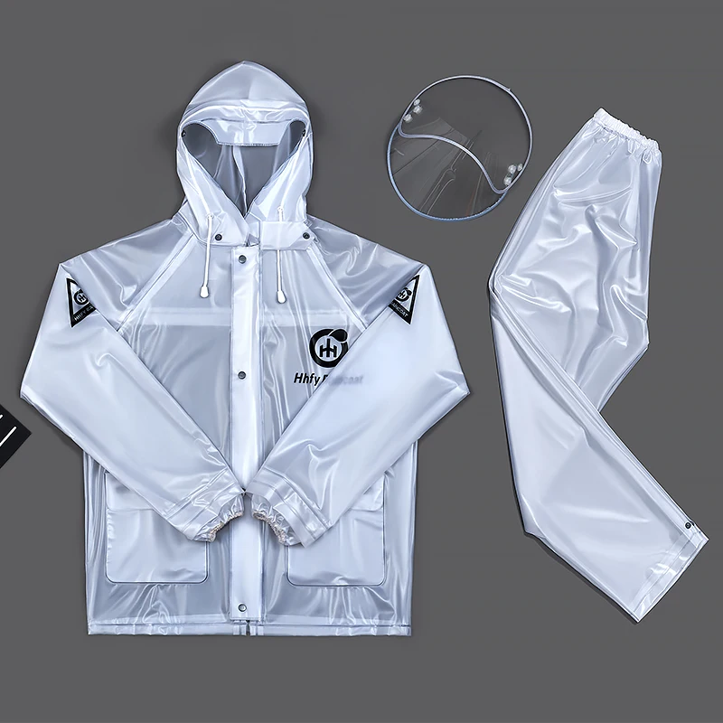 Keep dry and visible on rainy days with this clear PVC hooded rain jacket and trousers set. Designed for bike and bicycle riding, the transparent finish lets your clothing remain seen while providing reliable water resistance. The hood offers added coverage, and the full-length front closure helps block wind and showers during commutes or outdoor activities.