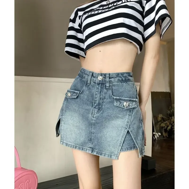 A compact take on vintage Y2K style, this Mini Wrap With Pocket Zipper Tight Short denim skirt blends retro flair with modern wearability. The high-waist silhouette creates a flattering, streamlined look while the wrap-inspired front and short hemline offer a playful, on-trend profile. Constructed in denim with a visible pocket and zipper detail, it pairs easily with tees, cropped tops, or layered knits for versatile seasonal outfits.