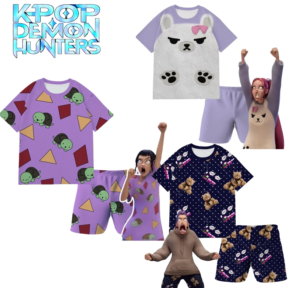 Bring fandom comfort to bedtime with these Movie KPop Demon Hunters Mira Zoey Rumi Cosplay Pajamas. Designed for adults and children who love cute, character-inspired nightwear, this set blends playful K-pop and fantasy motifs into soft, easygoing T-shirt and shorts pieces. The relaxed cut and lightweight fabric make it ideal for lounging at home, sleepovers, or casual cosplay-inspired fun.