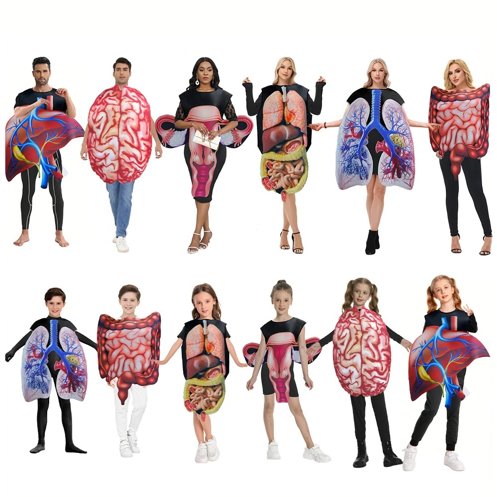 Bring anatomy to life with this Parent-Child Cosplay Human Organ Costume — a playful, educational outfit perfect for Halloween, parties, stage performances, or classroom demonstrations. The set features vivid 3D-style prints of internal organs such as the heart, brain, and lungs, rendered on comfortable, easy-to-wear fabric that makes the concept understandable and visually engaging for children and adults alike.