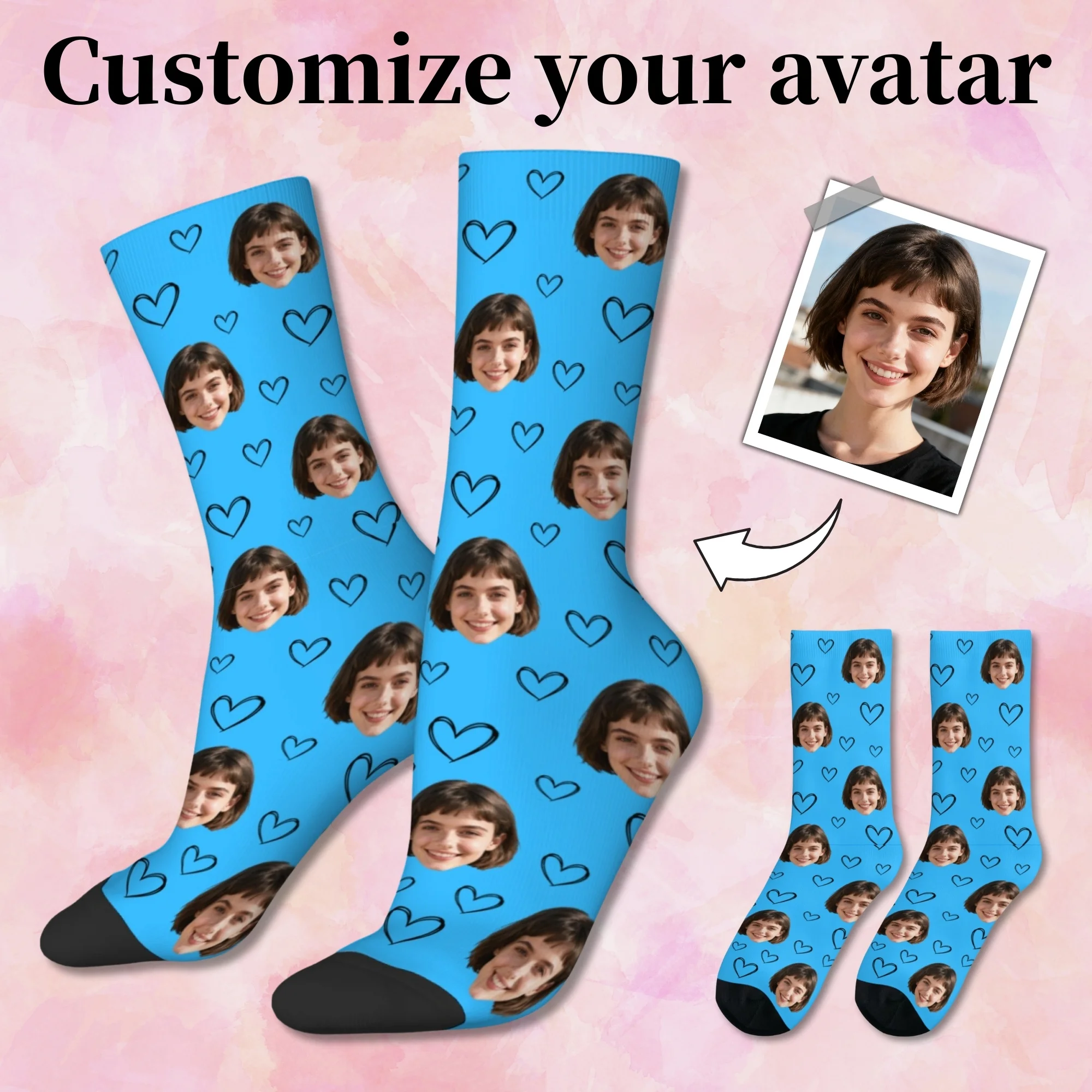 Celebrate special moments with these Personalized Photo Avatar Socks—playful, custom face socks designed as heart-shaped couple portraits. Made for everyday wear, they add a fun, personal touch to casual outfits or make a memorable anniversary or holiday gift. Upload your favorite photos and our printing captures facial features and expressions in a novelty avatar style across the sock for a bold, eye-catching look.