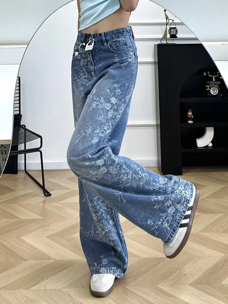 Premium Y2K Jeans — Artistic floral printed distressed denim in a relaxed, straight-leg palazzo silhouette. These floor-length pants blend vintage Y2K aesthetics with contemporary comfort: a relaxed waist and roomy hips that fall into a straight, palazzo-inspired leg for easy movement and a laid-back profile. Distressed detailing and an all-over floral print give each pair an artistic, lived-in look that pairs effortlessly with tees, crop tops, and layered jackets.